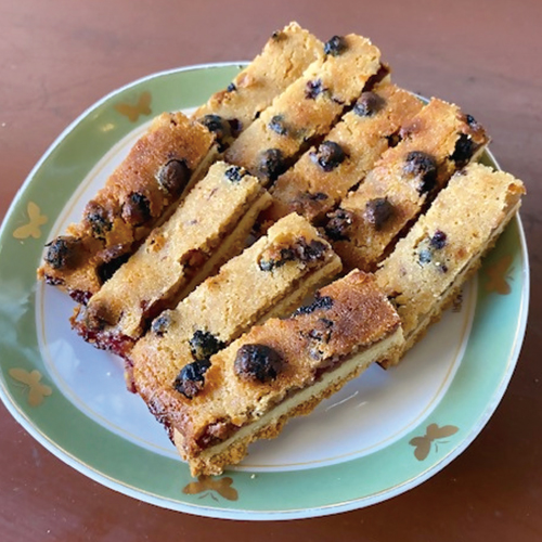 焼き菓子「ガトー・ブルーベリー」を「サクッ!」と頬張ると、バターとアーモンドの風味と共に、ラム酒漬けしたブルーベリーの酸味が口の中に広がり、自然と笑顔になります。